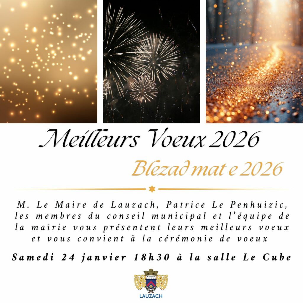 Monsieur Le Maire de Lauzach, Patrice Le Penhuizic, les membres du conseil municipal et l’équipe de la mairie vous présentent leurs meilleurs voeux et vous convient à la cérémonie des voeux qui se tiendra samedi 24 janvier 2026 à partir de 18h30 à la salle culturelle Le Cube.